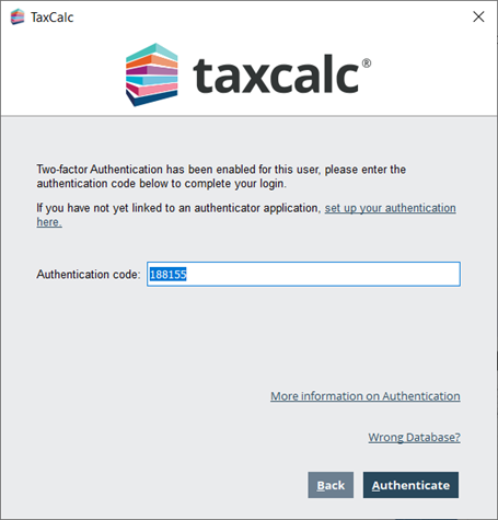 Switching TaxCalc databasesPlease note: If you switch databases to connect to a different TaxCalc database, when you switch back to a database that has 2FA enabled you will need to re-authorise using the original authenticator. If this is no longer available please follow the details in KB-3188 - How to reset the Two-Factor Authentication Details.