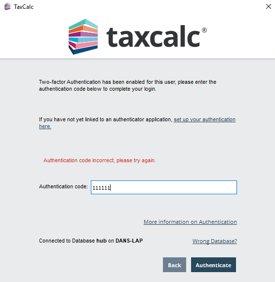 If you have enabled Two-Factor Authentication (2FA) for your login into TaxCalc you may experience an Authentication code incorrect, please try again message similar to the screen shot below.