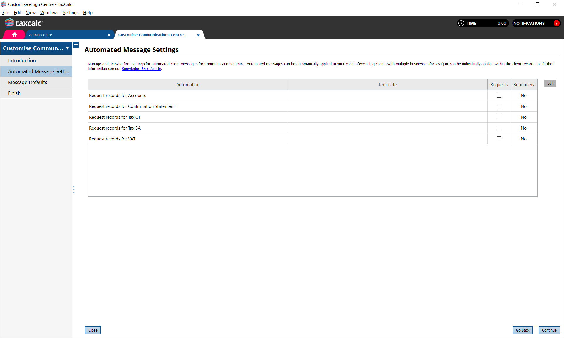 Once Communications Centre has been purchased, and if no automations are currently active, the Admin users will receive a notification within the TaxCalc Notifications Panel, where you can select Manage settings to automatically open the Automated Message Settings screen within Admin Centre.