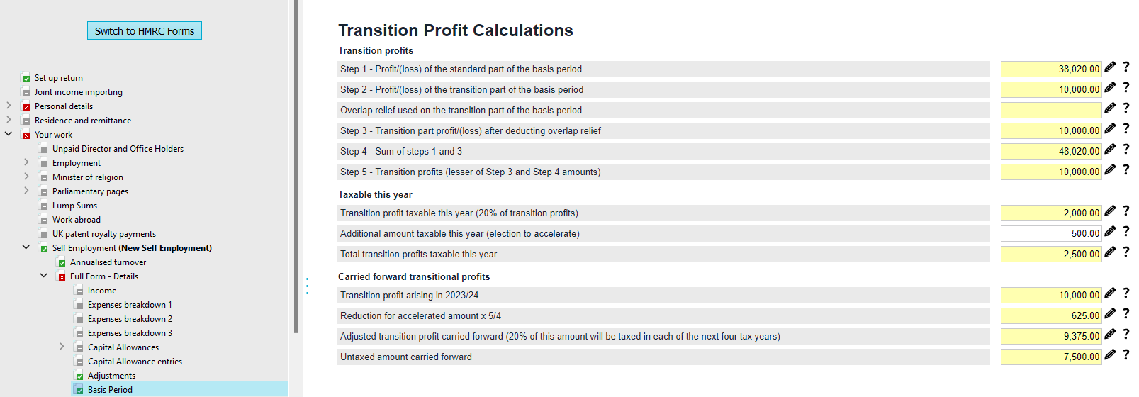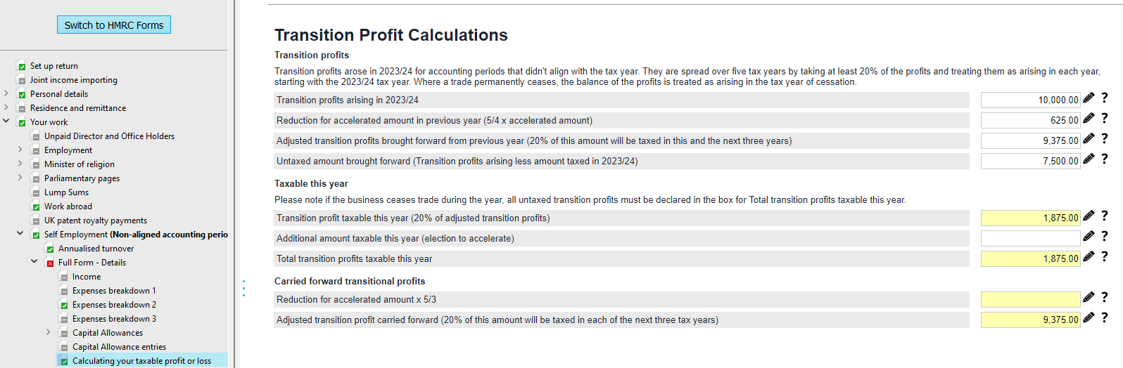 Standard trading profits of £38,020 Transition profits of £10,000 Total transition profits assessed in the 2023/24 tax year: £2,000 (20% default) + £500 (accelerated due to pension contributions extending the basic rate tax band). If TaxCalc was used to enter transition profits in 2023/24, the brought forward transition profit entries will be carried forward to the 2024/25 return (based on the details held on the 2023/24 return when the 2024/25 return is created), meaning you will only be required to populate any additional amount taxable in 2024/25 (claim for acceleration). If TaxCalc was not used in 2023/24, manual entries should be made. The transition profit calculations can found by clicking on the wizard next to box 73.3 (SimpleStep > Self-Employment > Full Form - Details > Calculating your taxable profit or loss > Click the wizard for 'Spread of the transition profit treated as arising in this tax year'. Entries should be made for the original transition profits along with any accelerated amounts in order to calculate transition profits to be assessed in the current year. The accelerated amount taxed in 2023/24 should be multiplied by 5/4 in order to calculate the correct amount to be spread over the remaining four years. This is because it will be multiplied by 20% to calculate taxable transition profits for the year: £9,375 @ 20% = £1,875 which will be paid for the next four years, if no further transition profits are accelerated £1,875 x 4 years = £7,500 - the actual remaining taxable transition profits. Therefore the expected entries for the 2024/25 tax year would be as displayed in the screenshot below, assuming that there are no accelerated profits to be taxable this year: