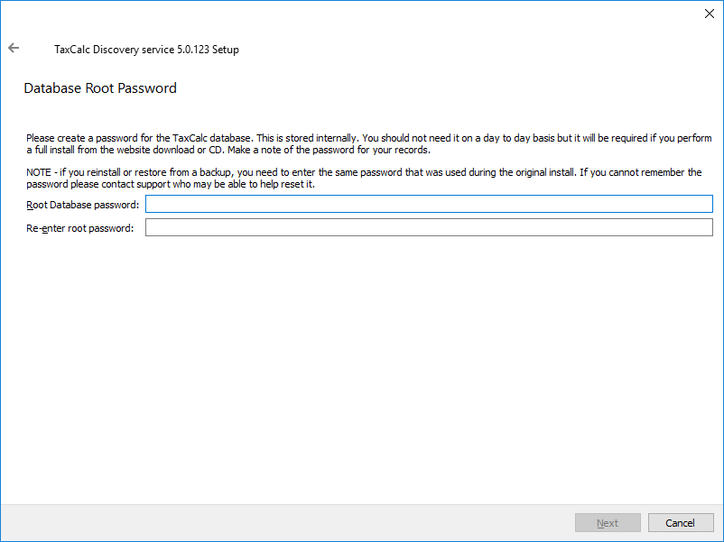 Delete the C:\TaxCalcHub folder before reinstalling TaxCalc. When creating the Postgres root database password on this screen use a password that does not contain any illegal symbols.