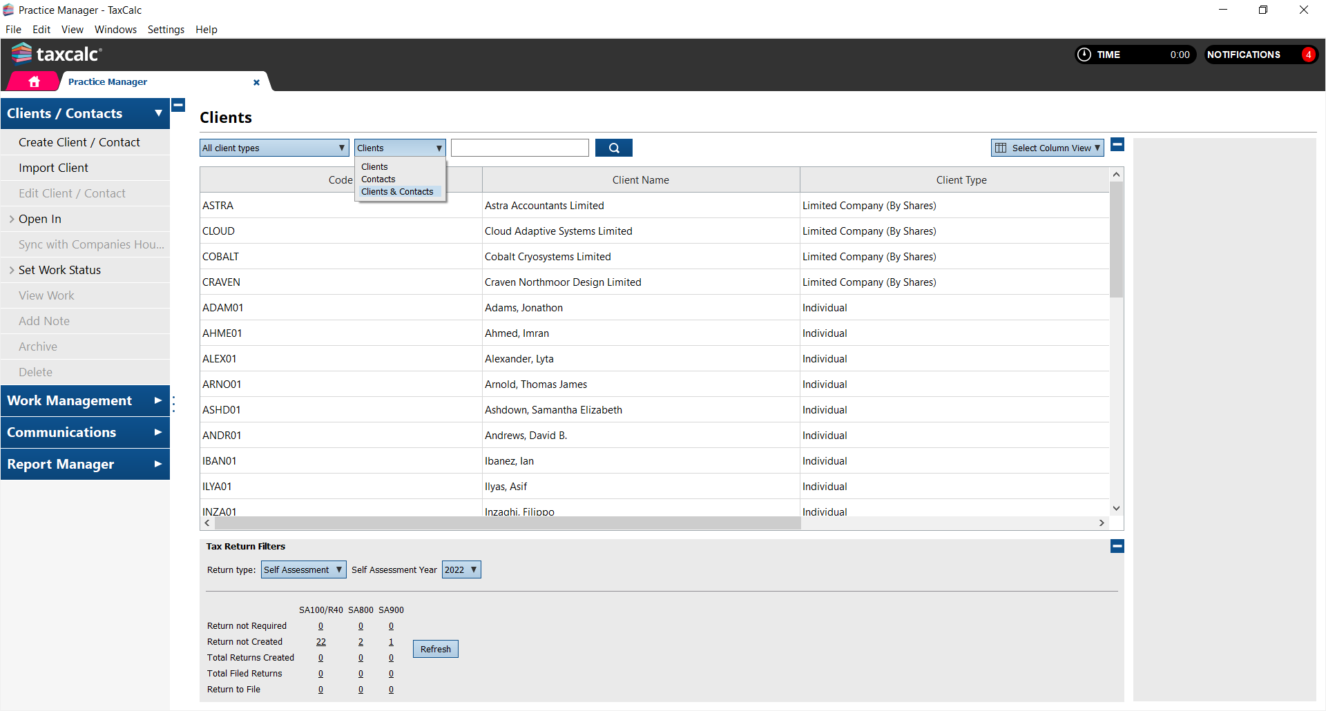 Within Practice Manager you can search for both clients and contacts simultaneously by selecting the Clients & Contacts option from the search client list dropdown list: