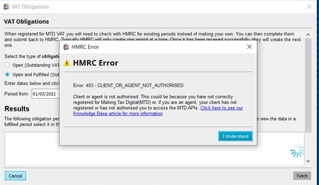If you have already filled under Making Tax Digital and you are receiving a 403 error (Client or Agent not authorised), there are multiple reasons this error can be returned but HMRC's investigations have shown that in over 90% of cases the reason is one of the following: