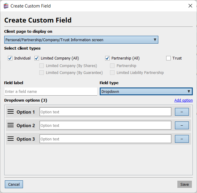 Within Admin Centre > Applications > Customise Practice Manager > Custom Fields, you can create a custom field with dropdown options. You can add as many as you need. This makes it much easier for users to select the correct information for the custom field.