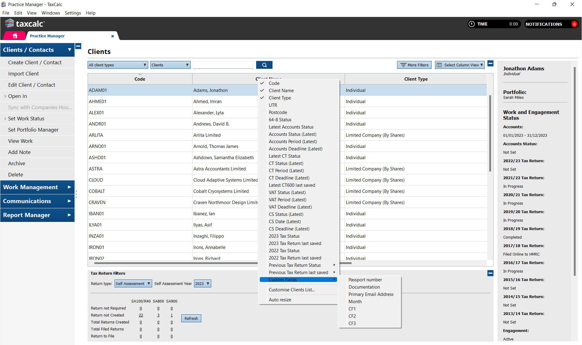 Within the client list in Practice Manager, you can add/remove columns that you want displayed by right-clicking over the column header. You can also add your custom fields to display as a column from here.