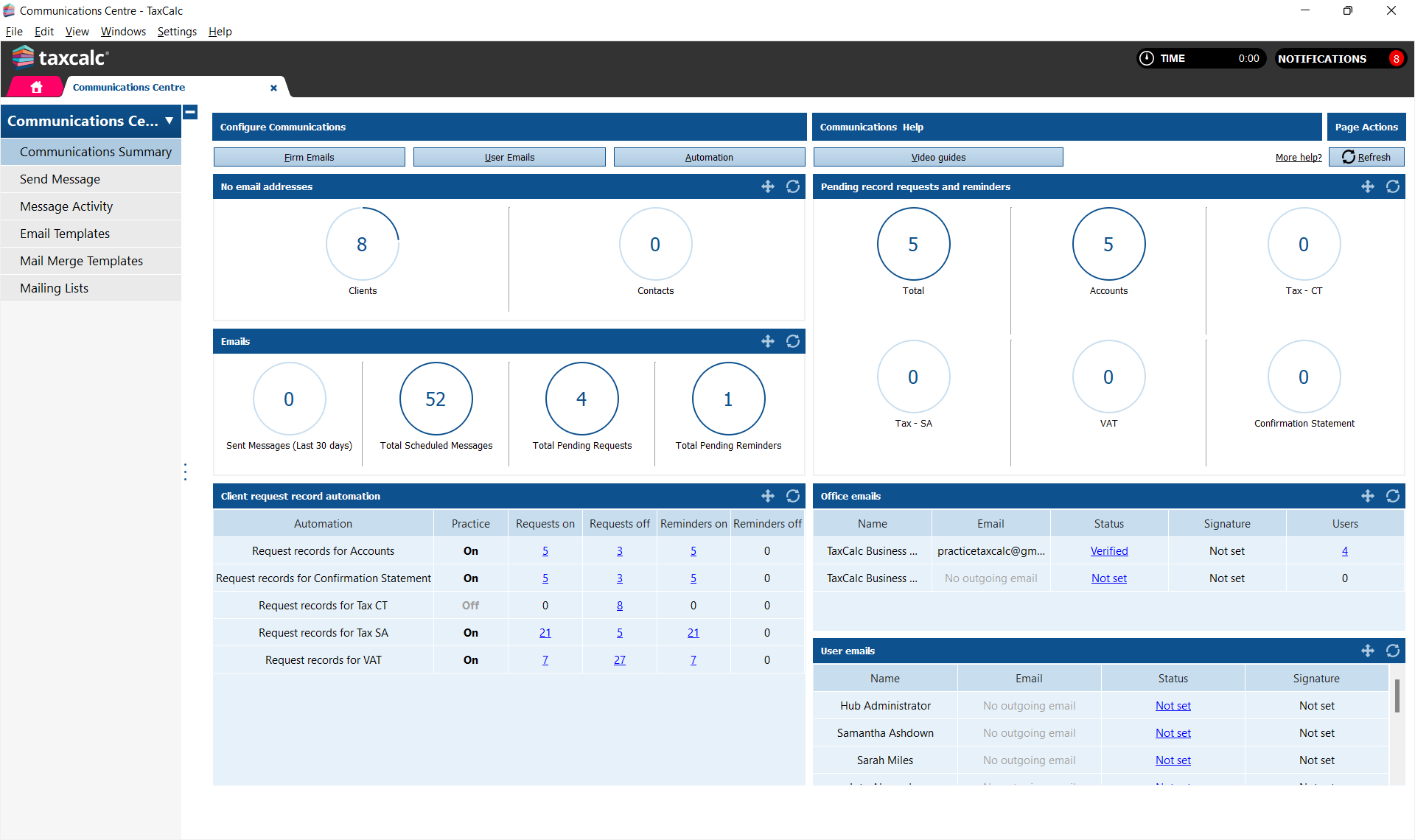 From the Communications Summary screen you can see all your communications activity at a glance. No email addresses - the number of clients and contacts that do not have an email address. Emails – the number of emails that have been sent or are scheduled, plus any pending requests and reminders. Client request and record automation - which automations are currently in use. Pending record requests and reminders - the total number of record requests and reminders sent. Office emails - which of your offices have email accounts set up and whether those accounts have been verified or not. User emails - which TaxCalc users have an email account set up and whether those accounts have been verified or not. Also, using the buttons along the top, you can quickly and easily navigate to: