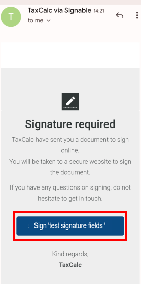 When an eSign envelope is sent from TaxCalc, your client will be prompted for signing via email (using the email address specified within the Recipients page). Please note that your clients will receive this based on the Signing Order also configured within the envelope.