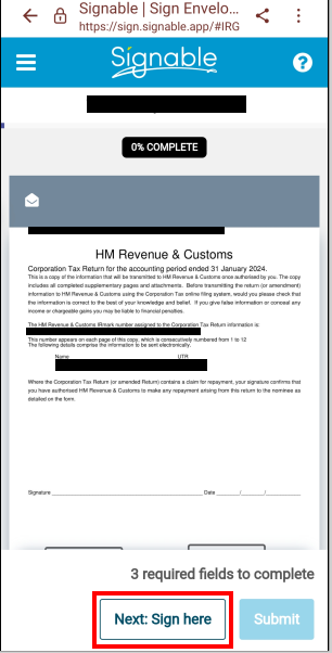 Please note that when you open the document, you will see at the bottom of the page (Next: Sign here). If you click on this it will automatically take you to the first document that has a Signature / Date field attached.