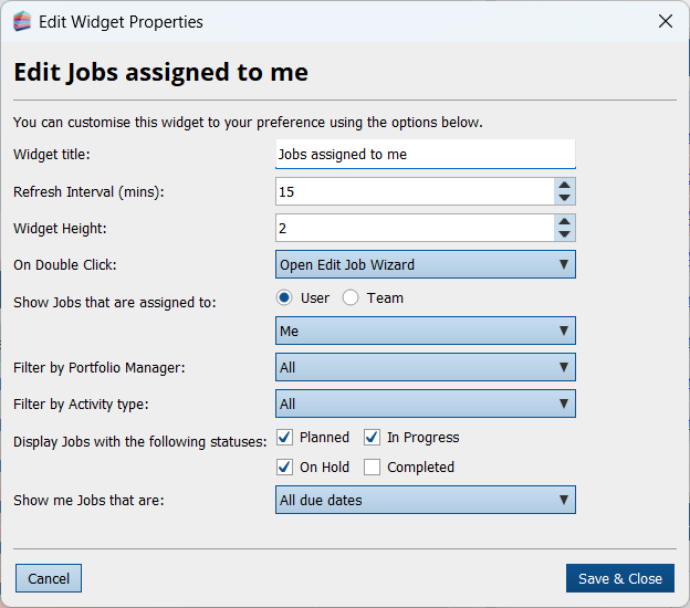 You can customise any Widget you have added to your Dashboard by clicking the arrow icon in the top right corner of the Widget and selecting Edit. From here you can change the Widget title, height and more. Jobs assigned to me and Tasks assigned to me Widgets, give you an overall view of work to be done. You can also customise and filter them according to assignees (either User or Team), Portfolio Managers and other work information. You can add multiple instances of the same Widget, each showing work with different filtering for better overview of the practice workload.