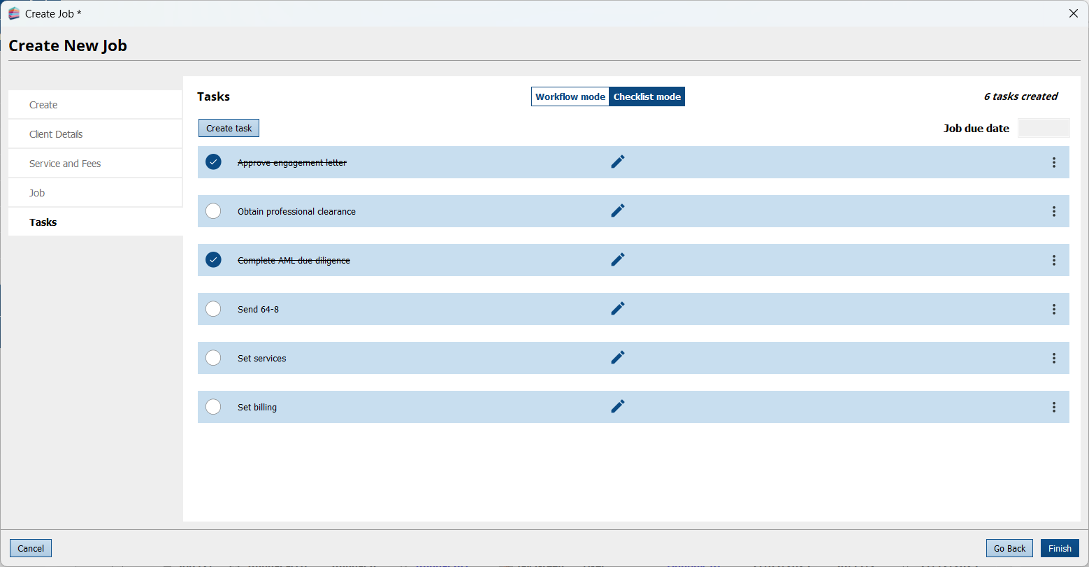 You can now create checklists within our Jobs if you have a WorkFlow licence. Simply create a new Job and on the Tasks tab select ‘Checklist mode’ on the top toggle. Checklists are also available within Job Templates in Admin Centre, so you can easily use them as templates for your practice’s Jobs. Checklist mode allows you to create a simplified list of tasks, perfect for smaller practices or for those admin procedures that do not need different dates or automation. Checklist items are automatically allocated with the job assignee and due date.