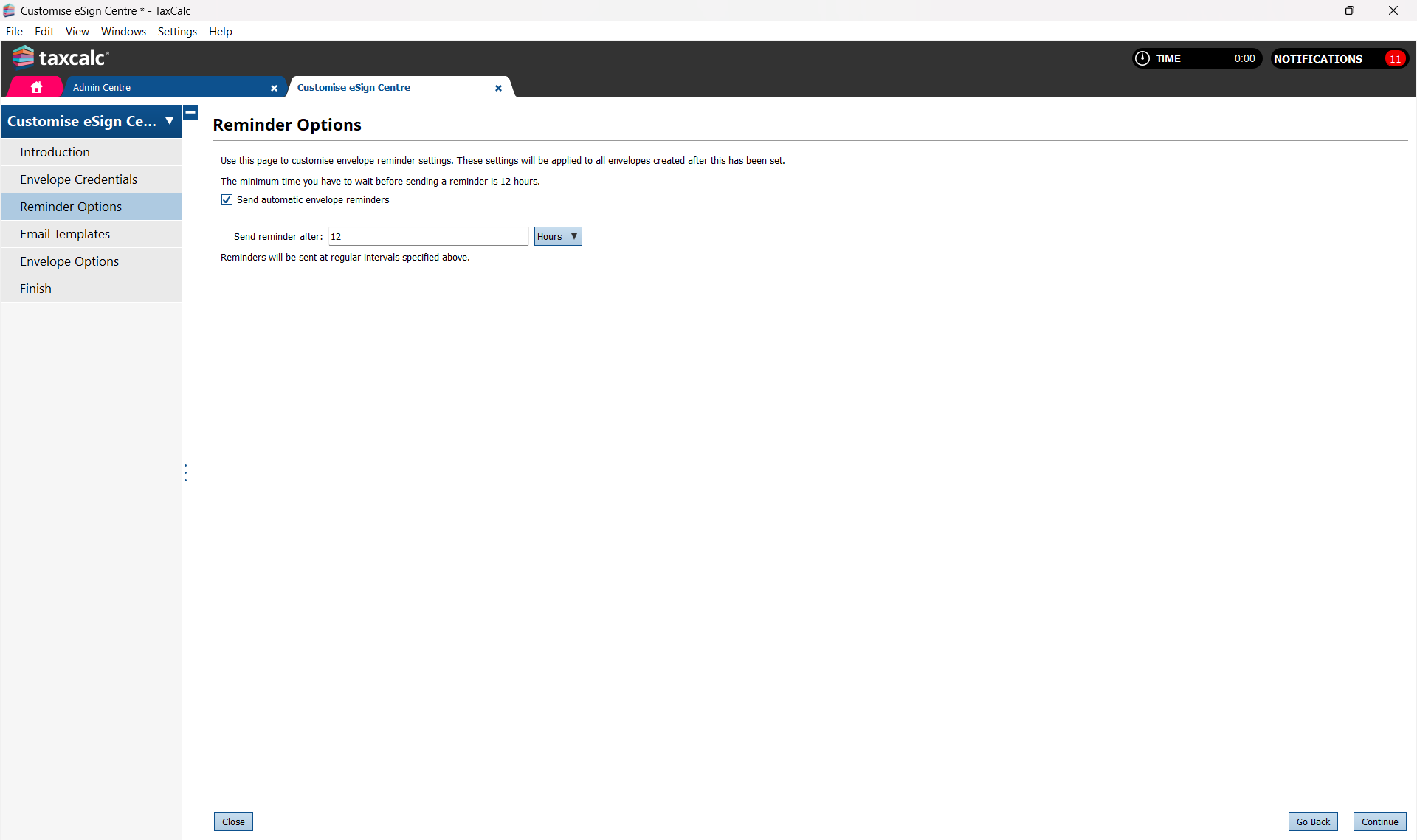 You can set an automatic reminder to be sent to any signing party for eSign envelopes. An ad hoc setting is available from within your envelope on the Recipients screen. The default setting can be customised in Admin Centre and be prepopulated for all envelopes. Go to Admin Centre > Applications > eSign Centre > Reminder Options