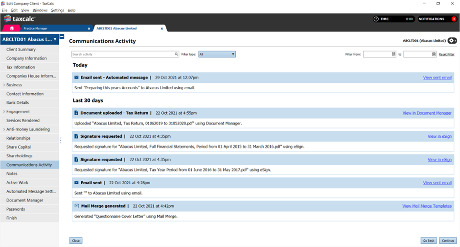 Within a client’s record, Communications Activity allows you to view the correspondence you have sent to clients. You can see the messages sent out to clients, who they were sent to, when they were sent and who in the practice sent them. This is particularly important for Practices to be able to maintain a record of communications with each client so that any member of the team can deal with a query from any client should they need to. Both electronic signing, document management and mail merge generated events can also be reviewed from this one central location so that you don’t need to look through various sources to find something.