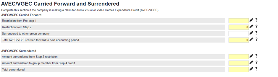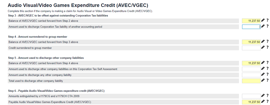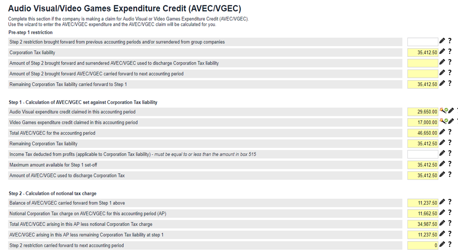 How to work out payable Audio Visual and Video Games Expenditure Credit (AVEC)Please note HMRC has not provided specified supplementary pages regarding Audio Visual and Video Games expenditure Credit yet, therefore TaxCalc has generated simple steps to facilitate calculation in the meantime. These steps will be accessible in simple steps mode Overpayments and repayments>Repayments for the period>Total payable creative tax credits. Pre-step 1 restriction Complete this section if you have brought forward from previous accounting periods and/or surrendered from group companies. Step 1 Audio Visual and Video Games expenditure on which AVEC/VGEC is claimed in this accounting period can be entered using the wizard to select whether the expenditure has been made. The Rate is determined for Film, animation, children programme, Drama, Video Games claim for this period will be complete automatically. Step 2 If you have AVEC/VGEC remaining after step 1, the amount is reduced by applying a notional tax charge to it. The notional tax charge must be based on the main rate of Corporation Tax for the accounting period. This step restricts the potential payable element and ensures that loss makers receive the same net benefit as profit makers (the credit being taxable). This ensures that the total cash benefit for all claimants is equal to the expenditure credit, net of tax at the main rate of corporation tax. The ‘notional’ tax retained under this step is carried forward and available to reduce the corporation tax liability of a later period of the company. Credit amounts brought forward from a previous period are not liable to a further notional tax deduction.