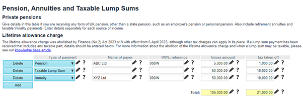 For an additional rate taxpayer, this can effectively be a rate cut from 55% to 45%. The exact effect depends on the taxpayer’s particular circumstances, however. For example, the tax cost could be higher if the extra income reduces allowances. It could be lower if the individual has lower rate bands or tax reliefs available. In TaxCalc, to accommodate the correct treatment for pensions lump sums after the abolishment of the lifetime allowance charge, we have updated the section under ‘Pension income and benefit’. From 6 April 2023 you will be using ‘Pension, Annuity or Lump Sums’ section. PLEASE NOTE: If your contributions had enhanced protection for the 2023-24 tax year the lifetime allowance excess tax charge may not apply to you. If this is the case you will not need to enter data in Taxable Lump Sum pension type. For more information click here. For more information about Lifetime allowance charge abolition for Tax year 2023-24 please click here Note – ‘Pensions – Lifetime Pension Allowance’ section should not be used from 06 April 2023. Where do I enter Pension, Annuities and Taxable Lump SumsHMRC forms mode- If you have pension income (other than State pension), retirement annuities and taxable lump sums in the tax year then as per HMRC guidance you will input data on - Page TR 3>box 11 and tax taken off on Page TR 3>box 12. These boxes will take you to the relevant wizard for data entry. Simple steps mode- Please use the updated section under ‘Pension income and benefits’ > ‘Pension, Annuity or Lump Sums’ We have provided a drop down list for you to select the relevant pension type based on your scenario. Fill in gross amount and tax taken off: