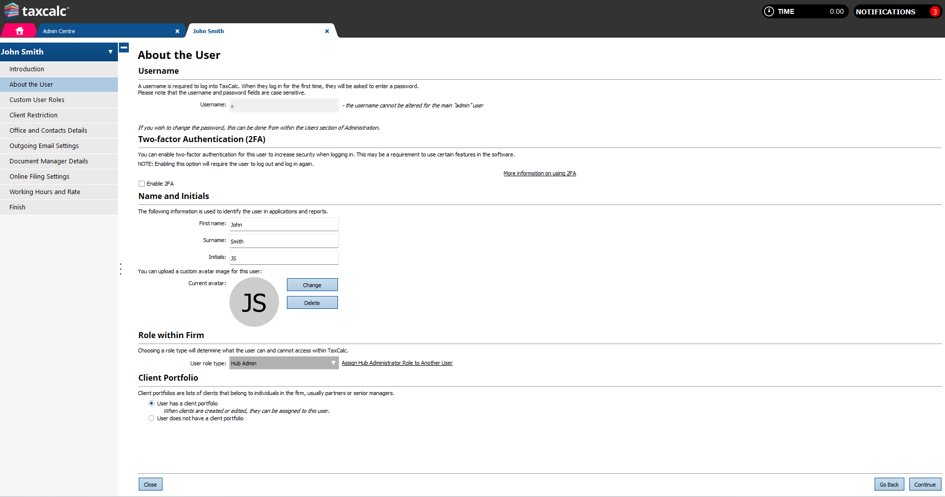 During the initial installation of TaxCalc, a superior administrator role is created called Hub Admin and this is assigned to the username admin. The Hub Admin role has additional permissions and options compared to other security roles in the system. Only the user holding the Hub Admin role, when logged in, can see a link to Assign Hub Administrator Role to Another User within their user record, on the About the user page.