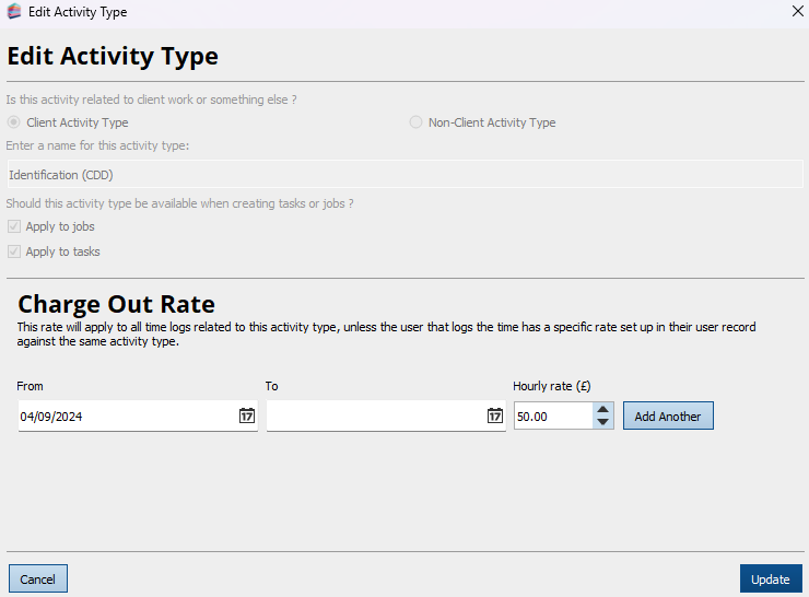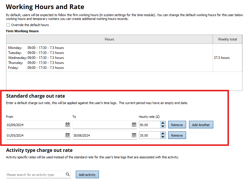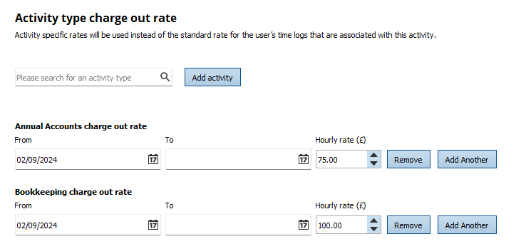 You can log multiple charge out rates for individual users. Each charge out rate will be linked to a separate activity as well as the standard charge out rate which is not linked to an activity. If the user has an activity specific charge out rate then this rate will be used when time is logged against this activity. If the user logs time against an activity with no specific charge out rate then the users standard charge out rate will be used.