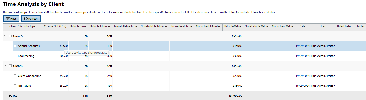 Additionally, when in the time analysis screen, if you hover over the charge a tool tip will appear which specifies the type of charge out rate used.