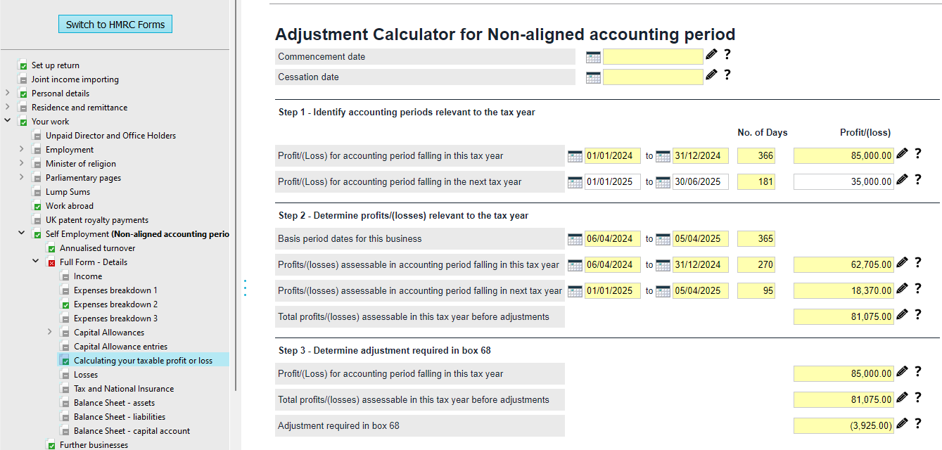When processing the information for the 2024/25 tax year, the Basis Period Reform will have already taken place. If you are unfamiliar with the rules surrounding this, it is recommended that you review this HMRC webpage for further information. If for any reason, a self employed individual has opted to prepare accounts using a non-aligned accounting period, an adjustment will be required in order to ensure that only profits generated within the tax year are assessed. This will be processed on the self employment full form via the Adjustment Calculator which is available against box FSE68 within TaxCalc (SimpleStep >Your Work > Self Employment > Full Form-Details > Calculating your taxable profit or loss > Adjustment (to arrive at the profit or loss of the taxable period)). Example if you have opted to retain a 31st December accounting period endThe basis period reform would have meant that for the 2023/24 tax year, profits up to 05/04/2024 were recorded and lodged with HMRC. The main accounting period would have been processed as 01/01/2023 - 31/12/2023 with any profits incurred between 01/01/2024 - 05/04/2024 entered as transition profits. When declaring your information for 2024/25, you will enter the main accounting period ending 31/12/2024 on the SA103 self employment tax return pages, with an adjustment to align profits/losses with the tax year. If trading profits for 01/01/2024 - 31/12/2024 are £85,000 and at the point you come to file the tax return, trading profits for 01/01/2025 to 30/06/2025 are £35,000: The adjustment required in box FSE68 would need to:
