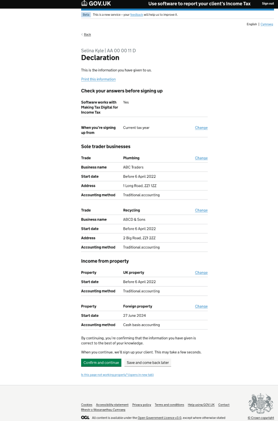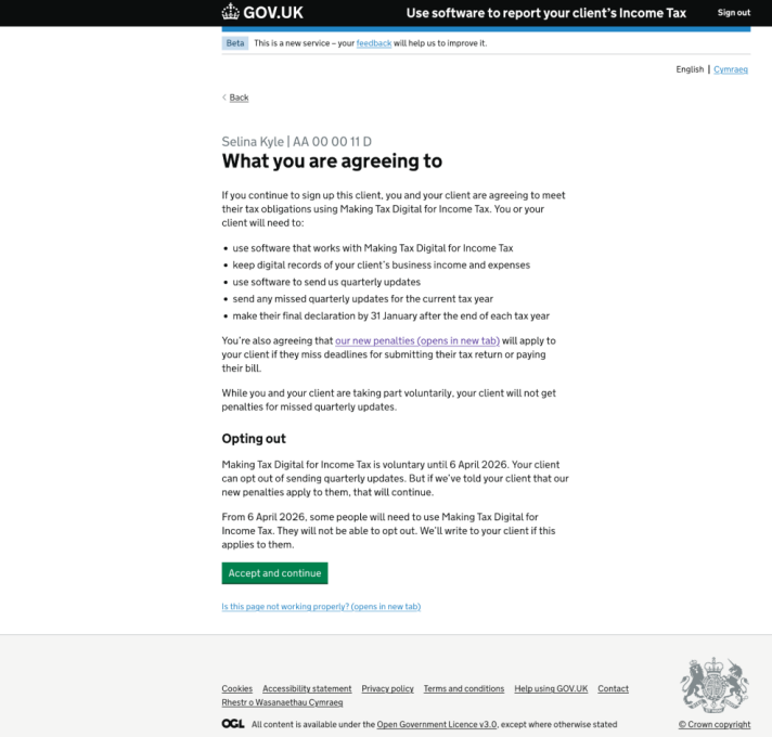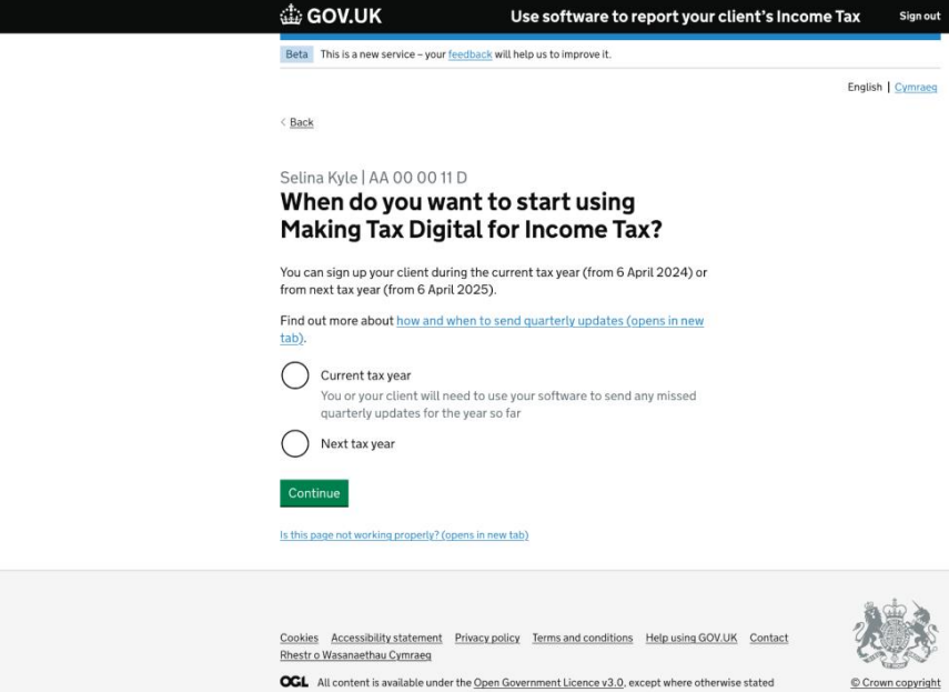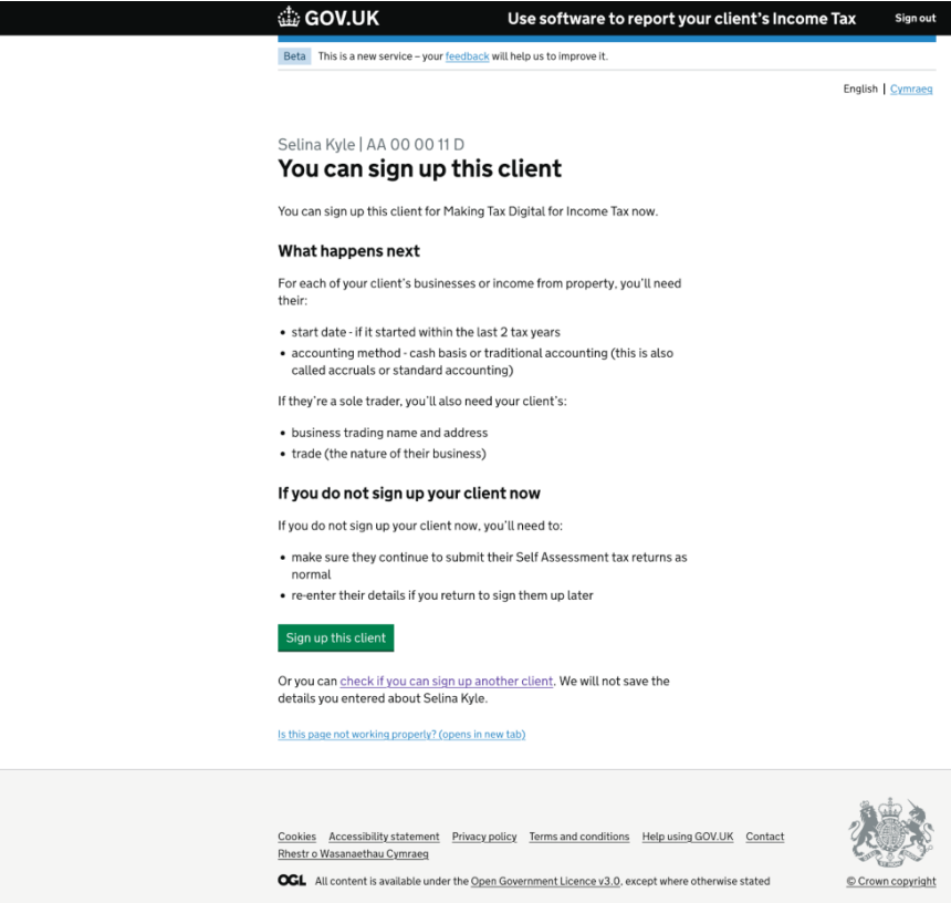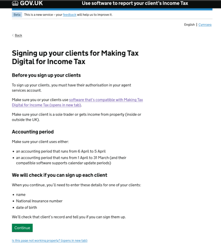 If you have clients who will be required to report income under MTD for Income Tax from April 2026, you will need to sign up your clients with HMRC beforehand. It is possible to sign up clients now to help test the service and this will be necessary before using software, such as TaxCalc's MTD Quarterly Filer. The following steps depict an agent journey through the HMRC online sign up process, which we hope will provide an insight into what to expect and what information is required. First, you can check whether your client is eligible to sign up for MTD: