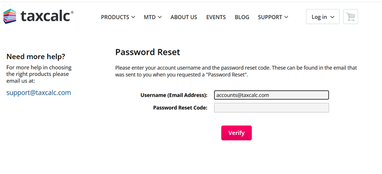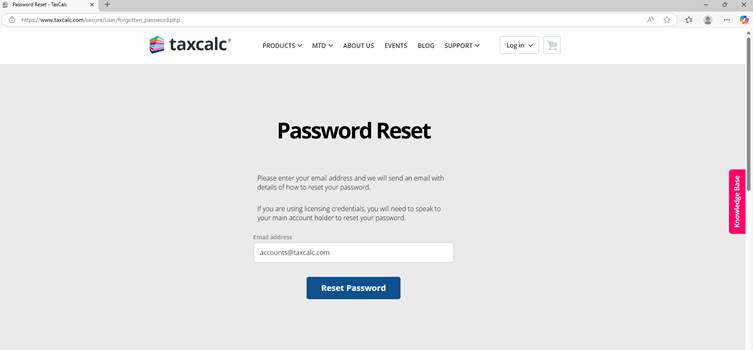 - Enter the email address you use to login to TaxCalc and click Reset Password.