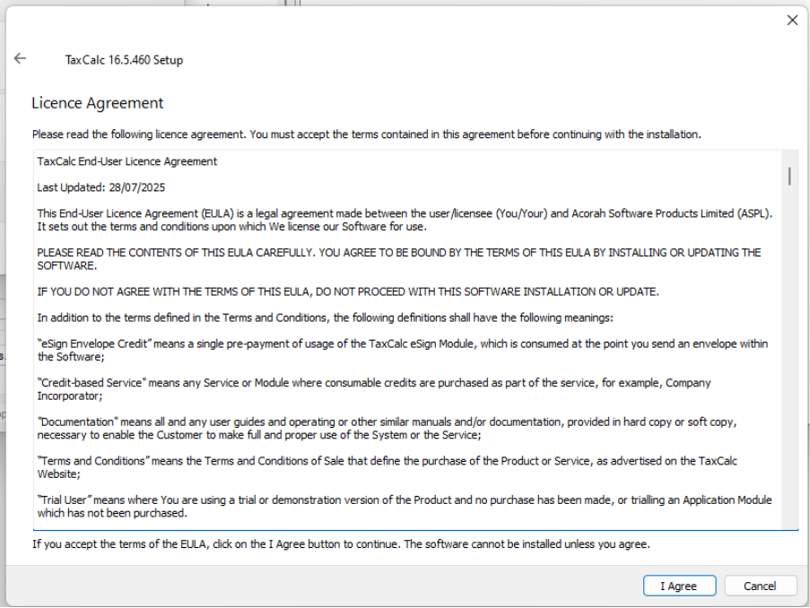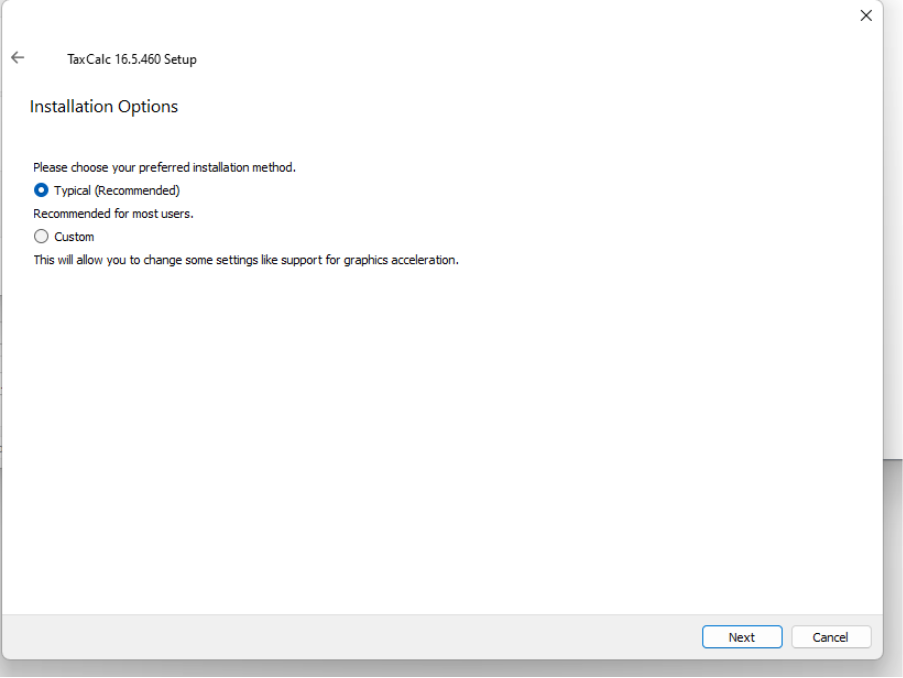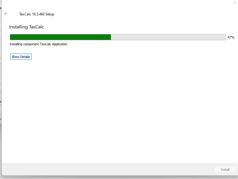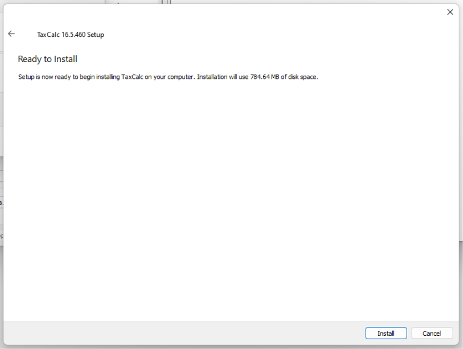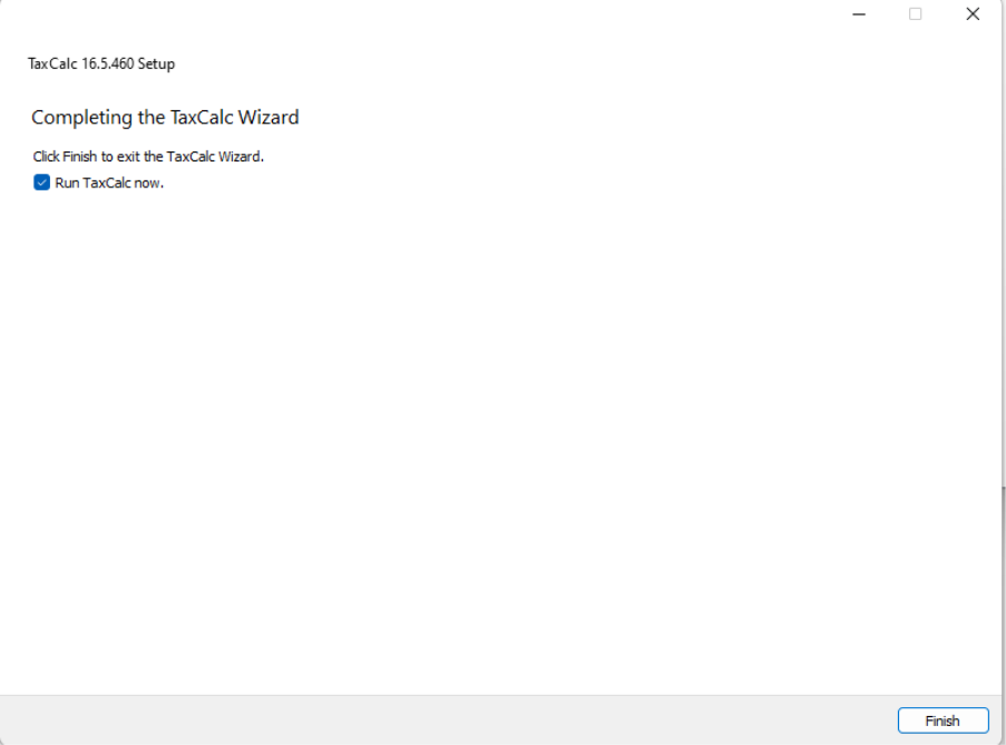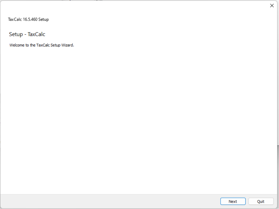 Installing the new (QT6) version of TaxCalc release 16.5.460+NOTE: The new version of TaxCalc 16.5.460 can be used on one (or more) machines in your office without affecting any existing users. The new 64-bit QT6 version and the current 32-bit version of 16.5.460 are compatible with each other when connected to the same network or cloud database. We are currently phasing this release out and please contact support@taxcalc.com to request this release. In the future this will become a standard release for all users. Ahead of updating any TaxCalc application it is good practice to ensure you have a recent backup taken. Download the windows installer (you should have been provided with a link to do so) and run it on the machine that you are upgrading.