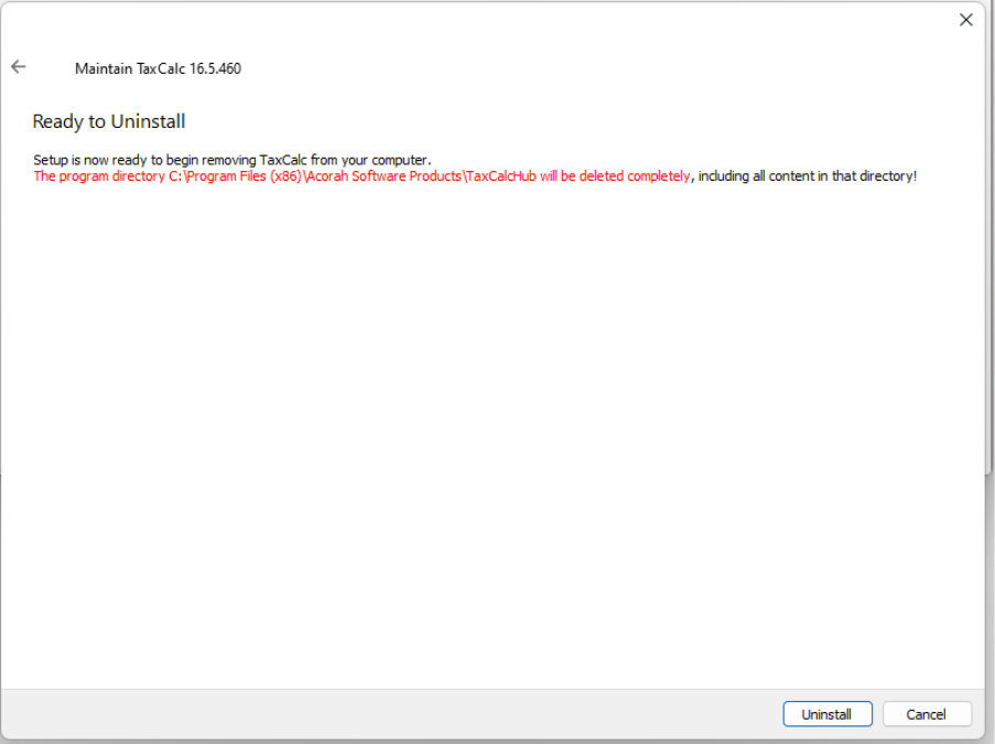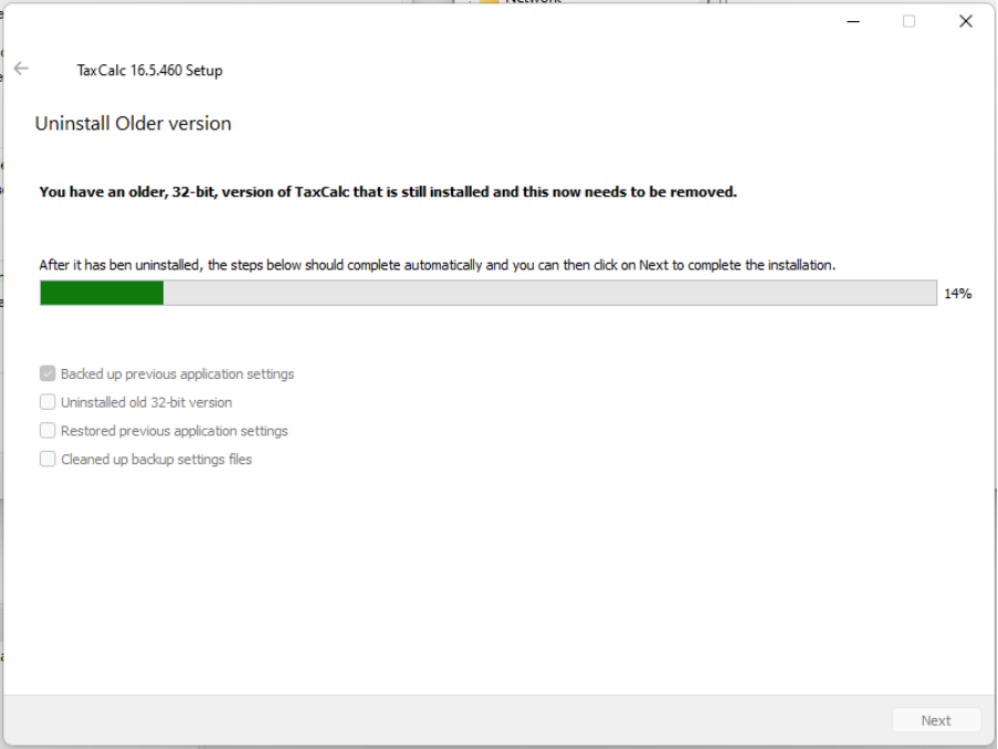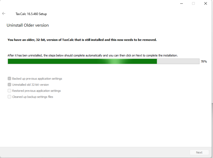Removing the existing 32-bit installation On the next screen, if you have the 32-bit older TaxCalc installed, you will be asked to remove it. The following screen will appear (and the Uninstaller for the older version should open a few seconds later):