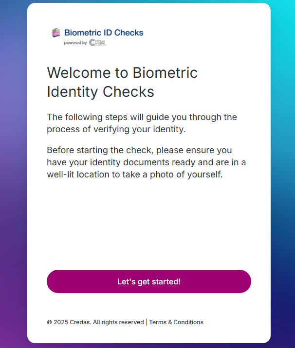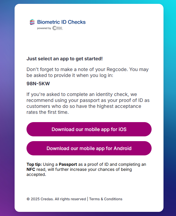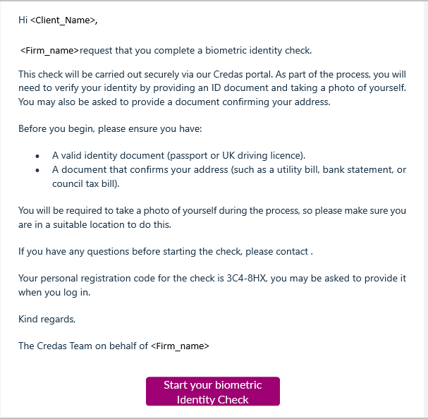 Your client will receive an email/SMS providing them with a link to complete the biometric identity check and a personal registration code. Selecting ‘Start your biometric Identity Check’ will start the check