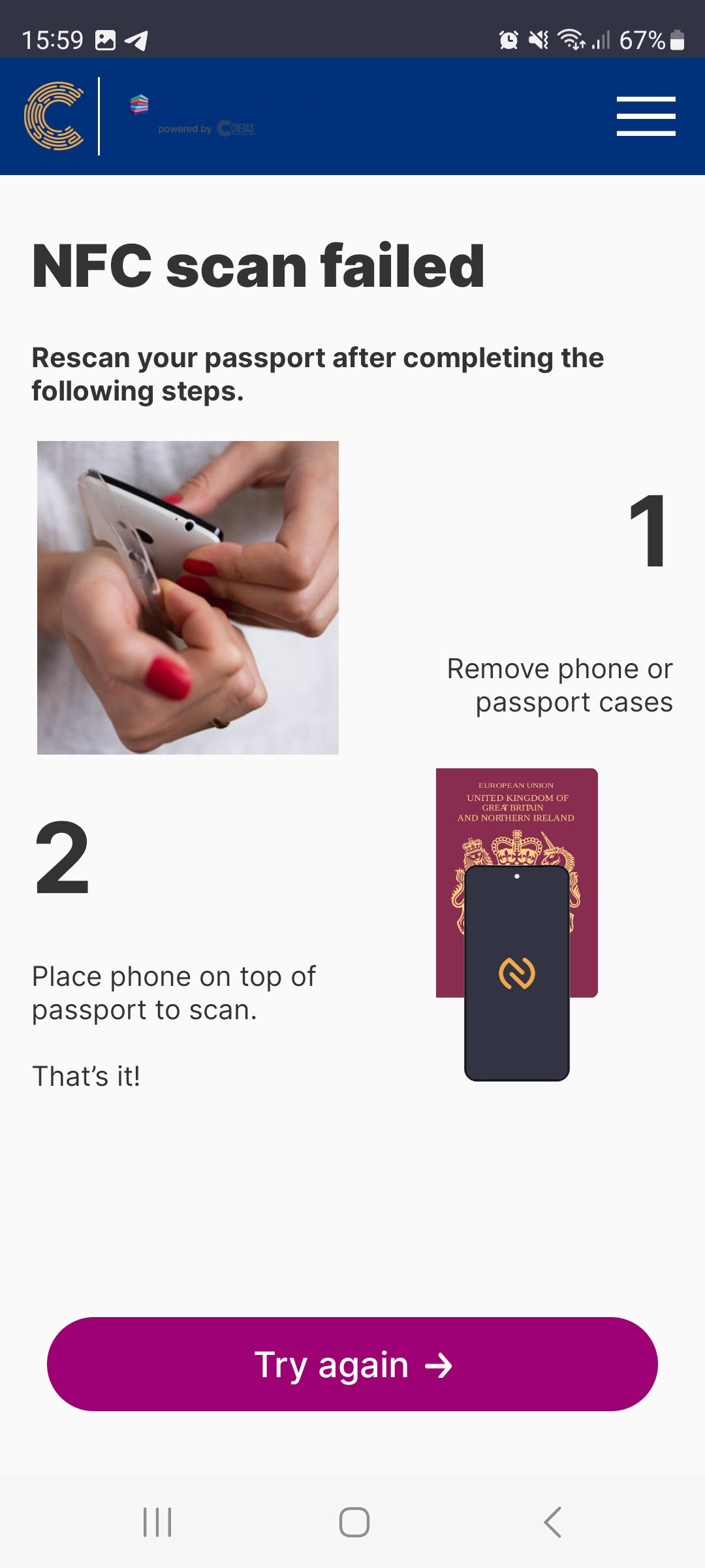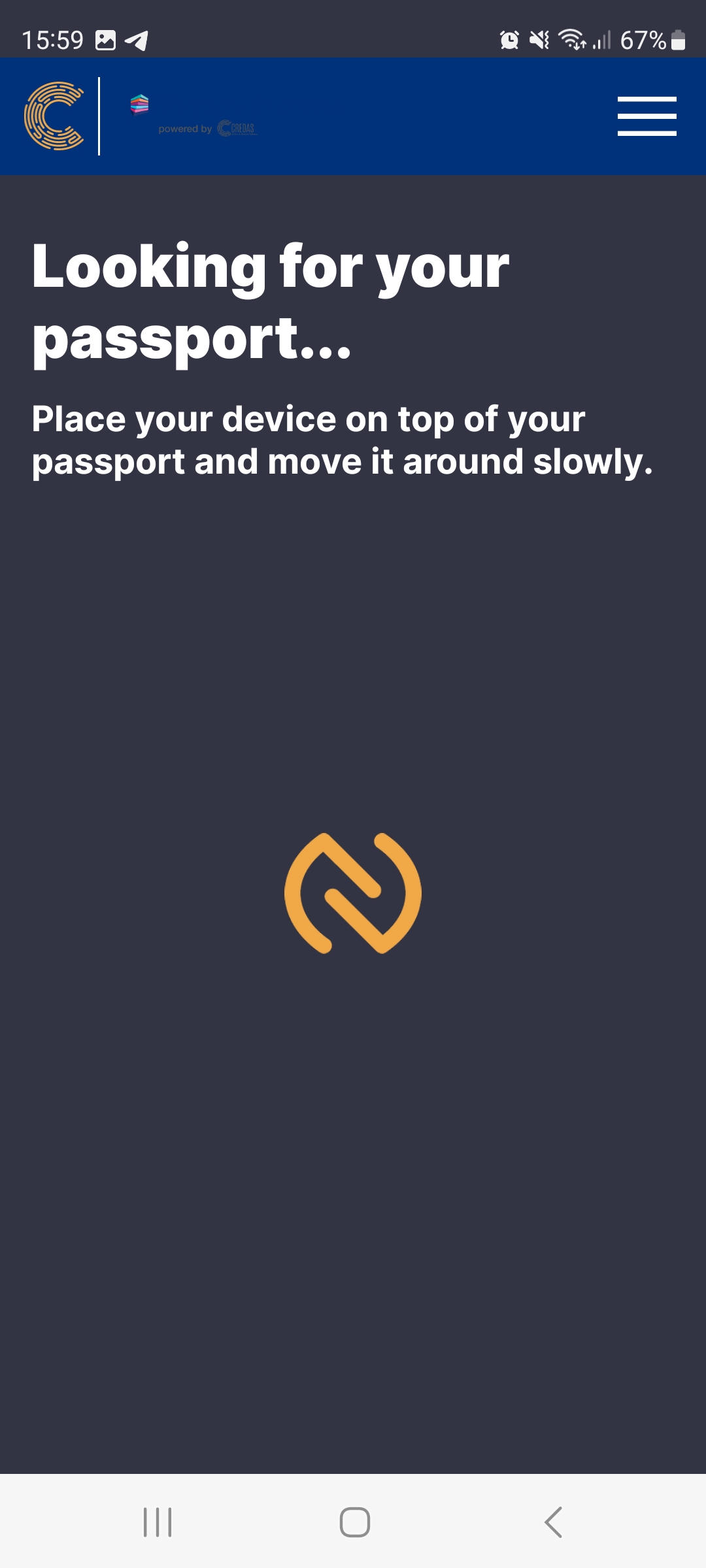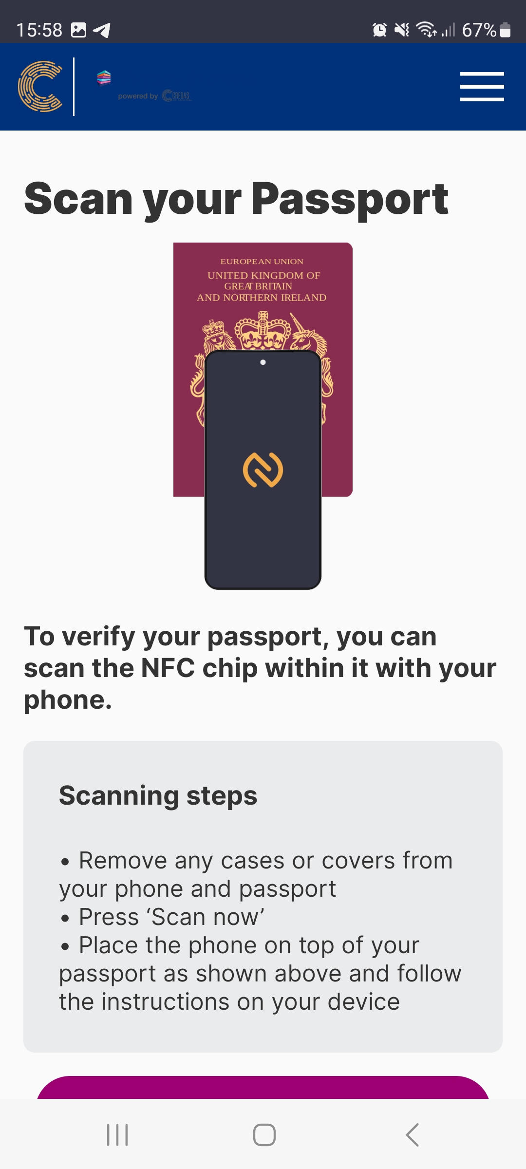 - If your client has selected to use their passport as their identity document, during the next step, they will be asked to scan the NFC chip using contactless technology - holding the phone in physical contact with the passport, with the phone on top of the passport just as they would when completing a contactless payment.