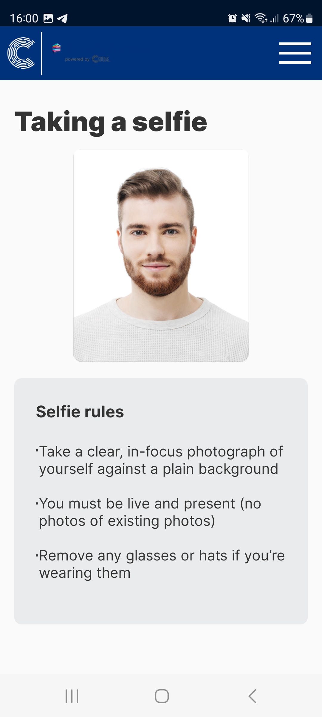 - Your client will now be asked to take a selfie to confirm they are live and present: