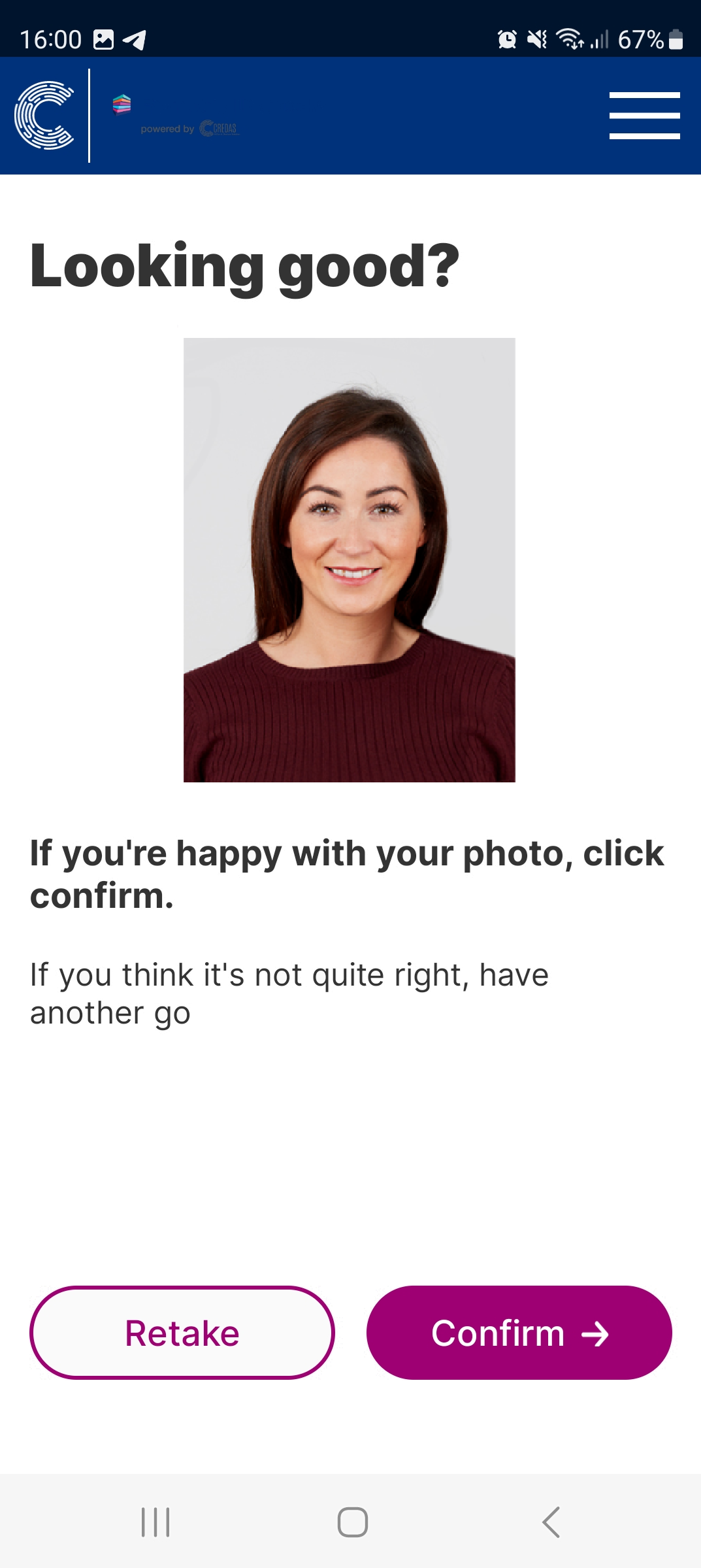 - The guidance on the screen will help them to take the best picture possible, ensuring the eyes and face line up with the gridlines. Once the picture is taken, your client can review and retake it before submitting: