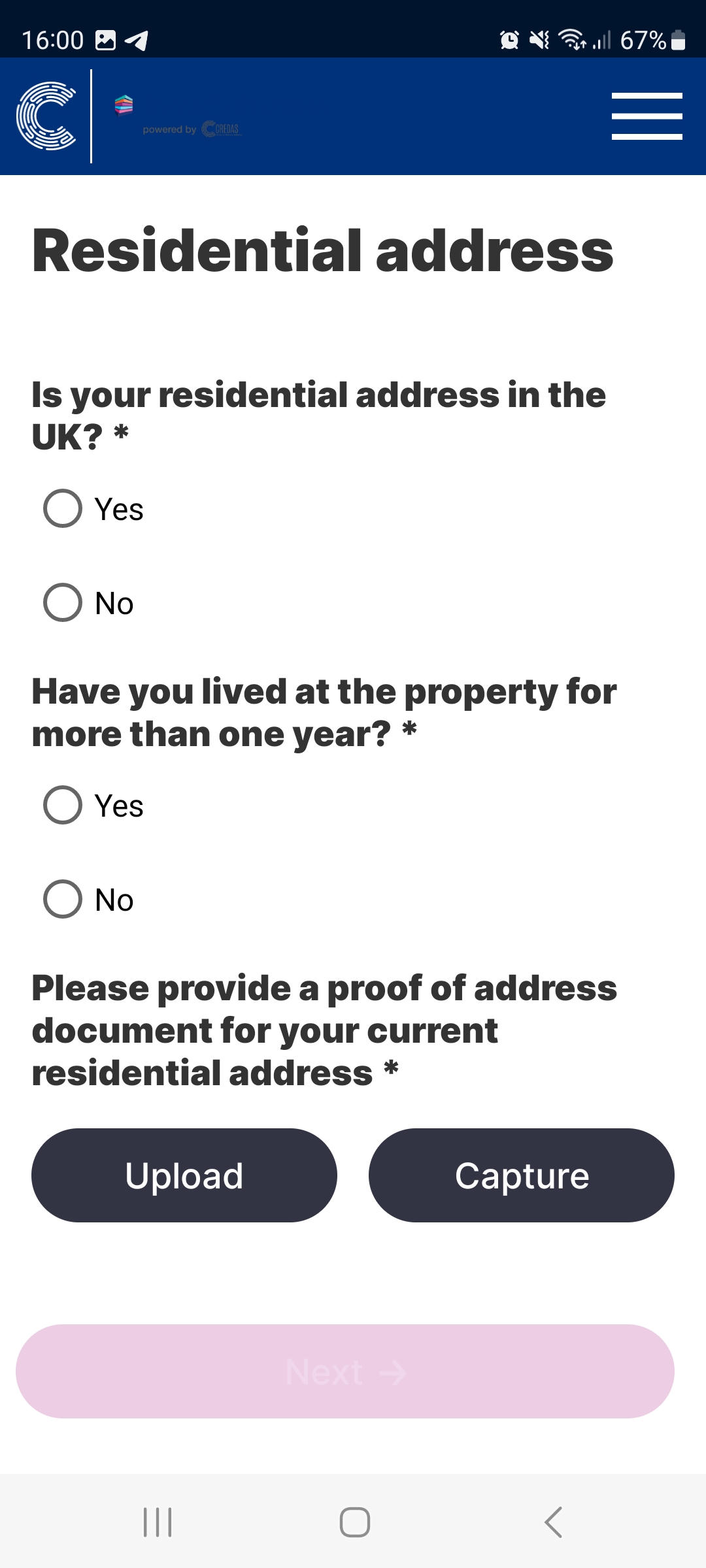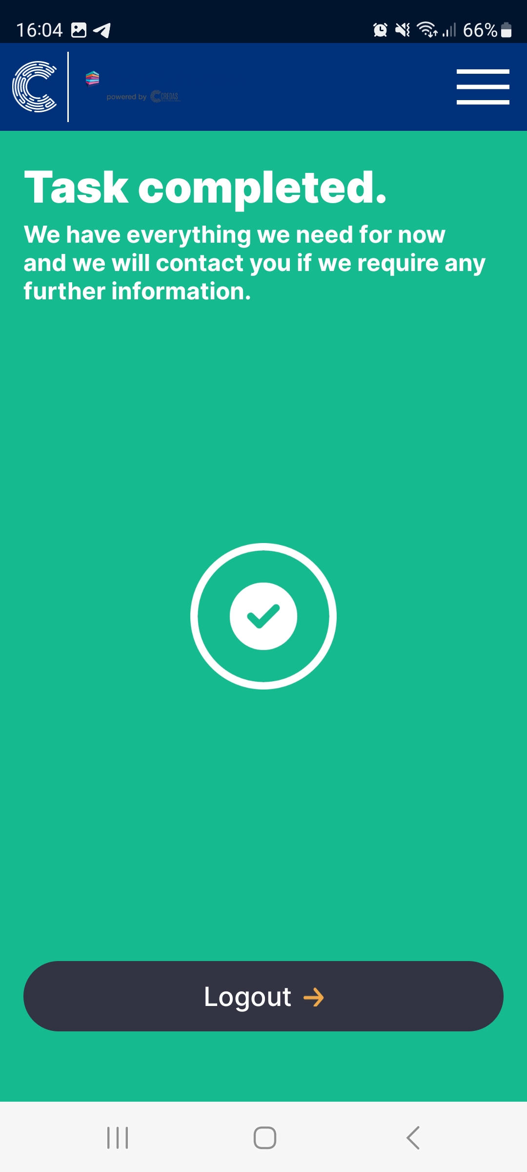 - Once the proof of address document is uploaded and the client selects “Next”, the check is complete and your client can logout and close the app.