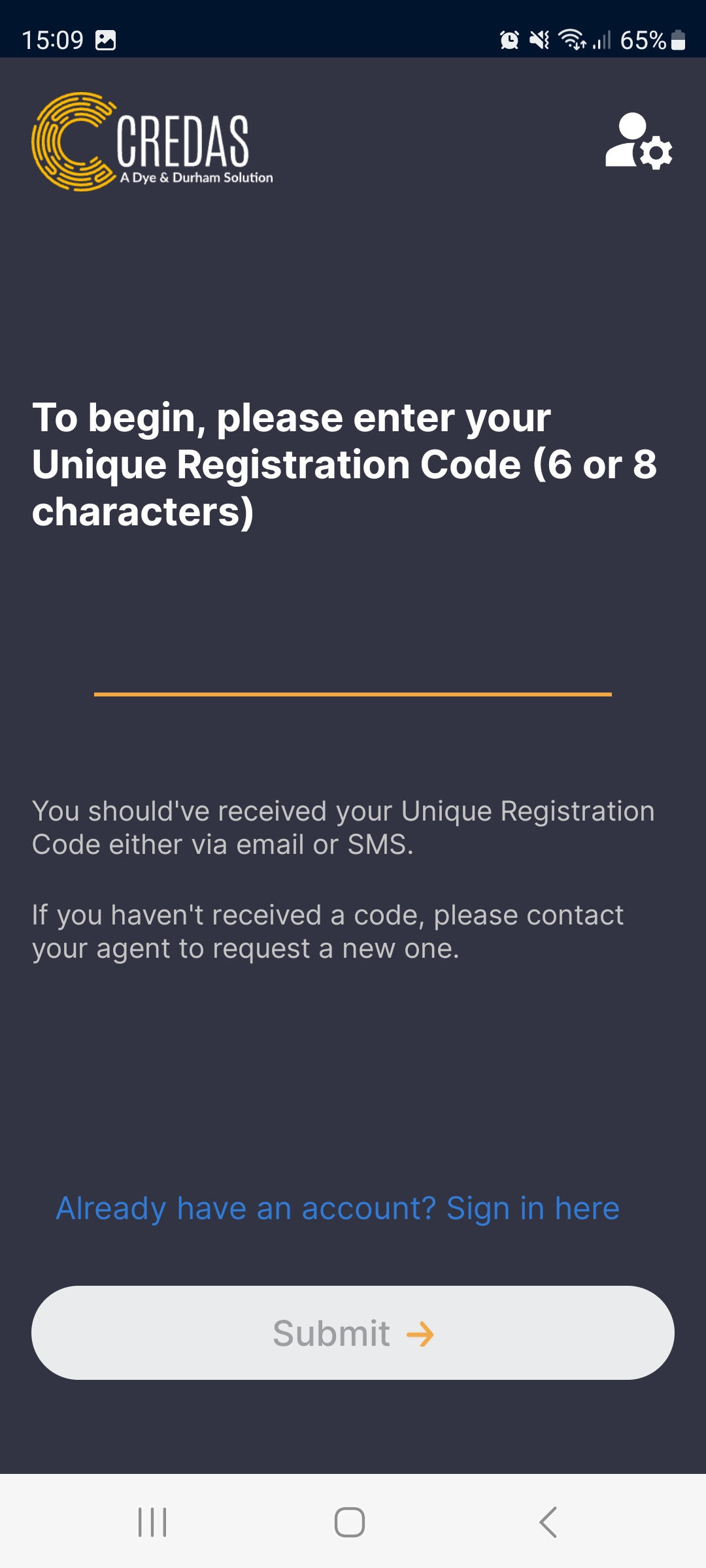 - The app will ask your client to enter the registration code received in the email and/or SMS: