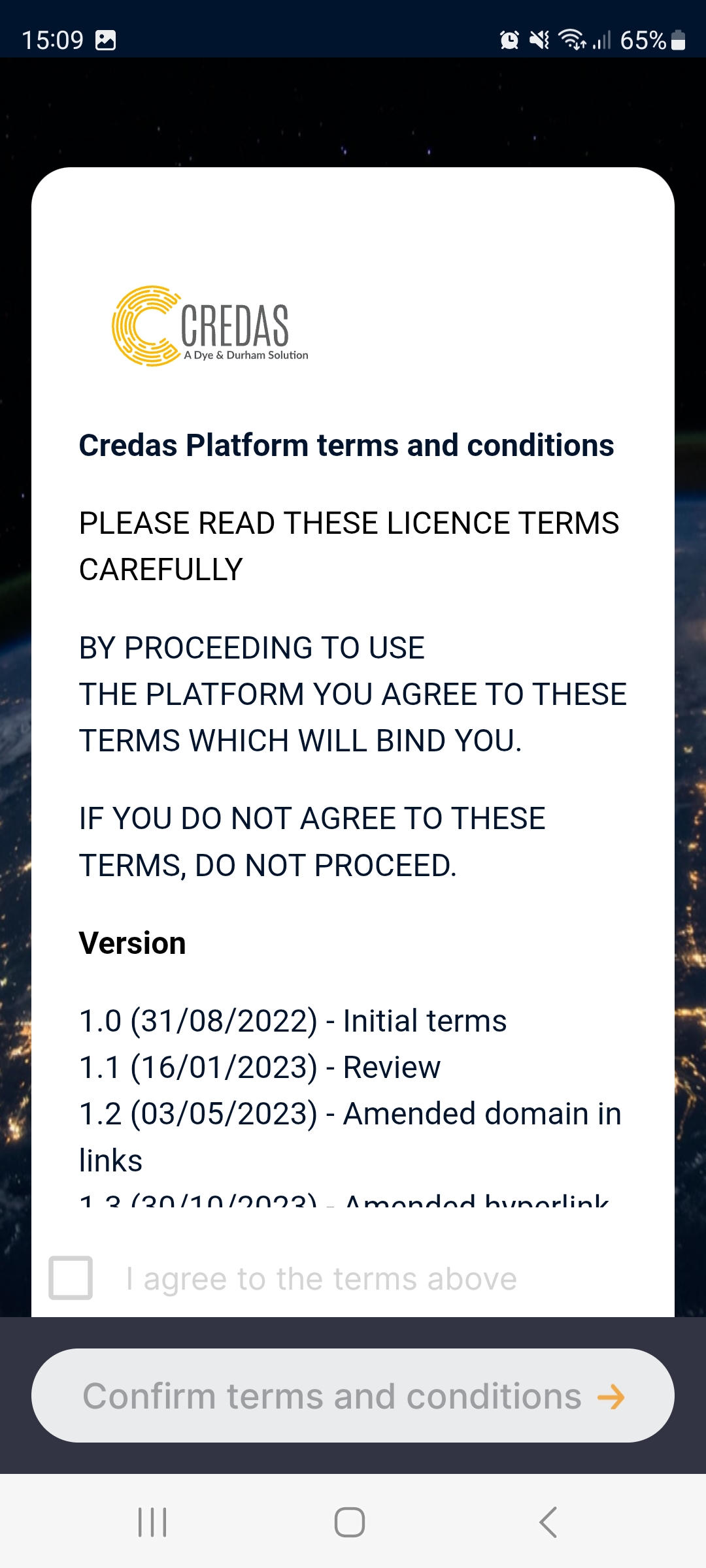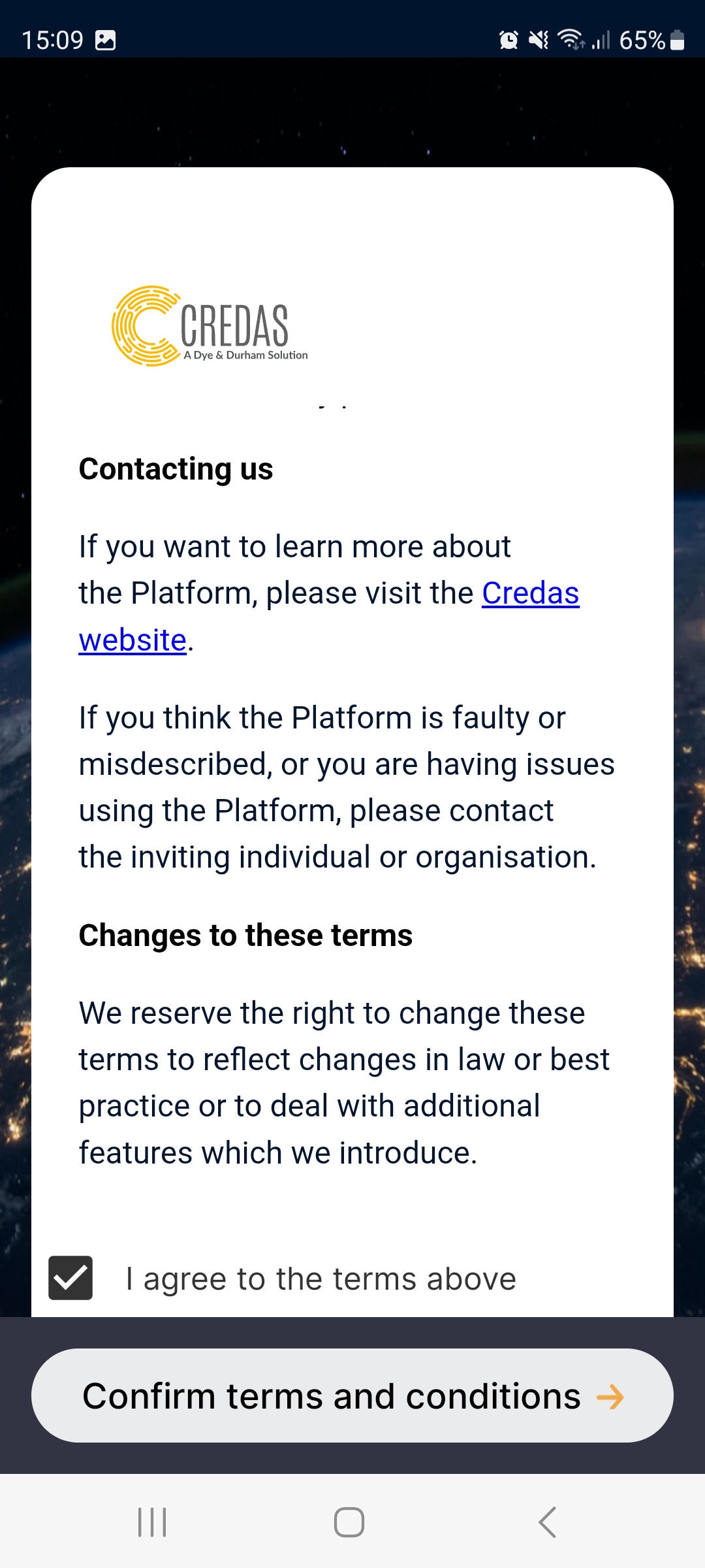 - In the next step your client has to read through and accept the Credas Platform terms and conditions:
