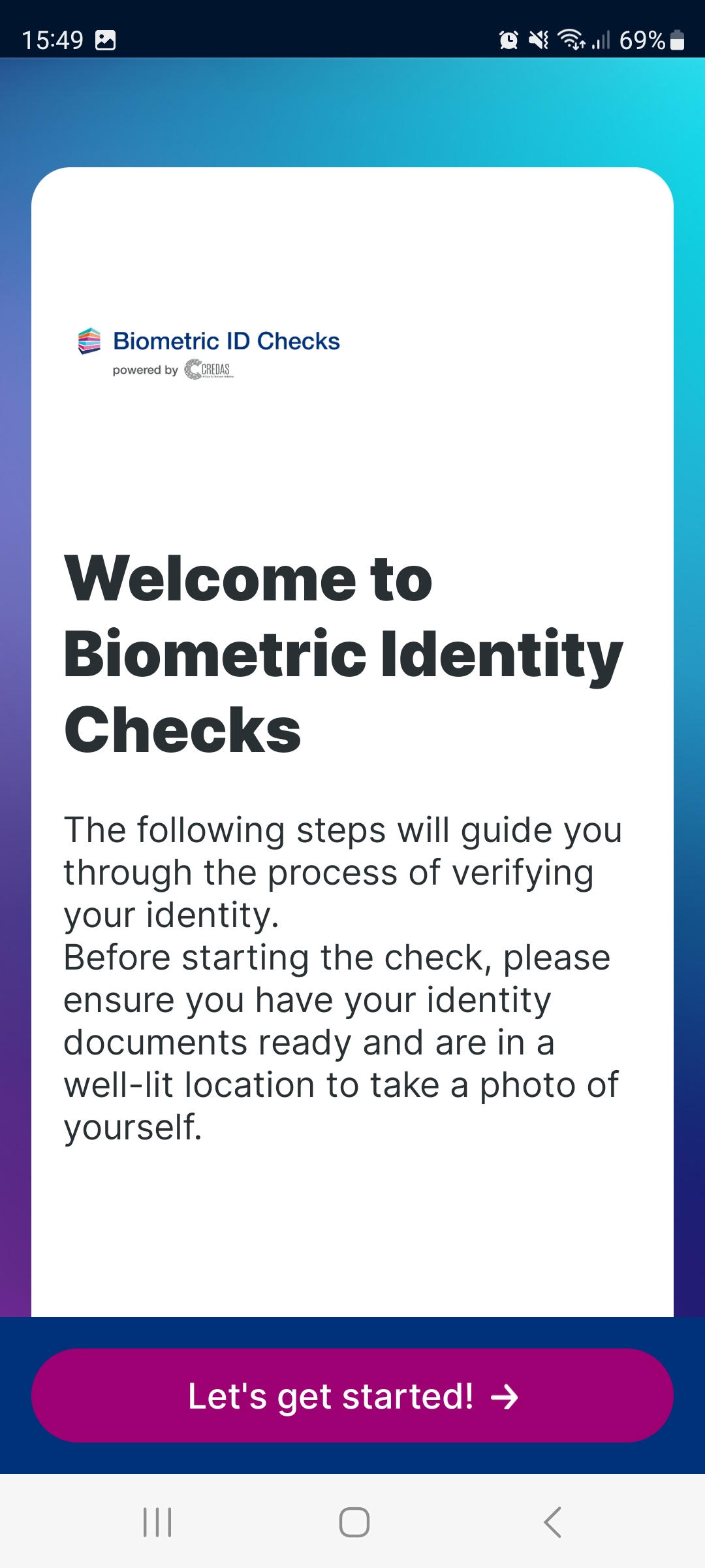 - The next screen reminds your client to have identity documents ready and be prepared to take a selfie: