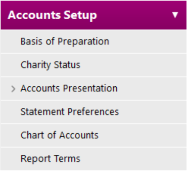 Enter the charitable activity name as you wish it to be displayed in your charity reports. Please note that duplicate charitable activity names are not permitted. There is no limit to the number of charitable activities you can create. Accounts SetupYou can customise the account settings for the charity accounts by using the screens within the Accounts Setup.