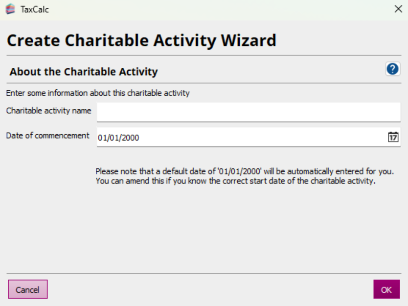 When creating a new fund, enter the fund name as you wish it to be displayed in your charity reports. Please note that duplicate fund names are not permitted. Each fund will need to be assigned to a class of fund e.g. Unrestricted, Restricted or Endowment. If your fund is a revaluation reserve or fair value reserve, you will need to specify this by ticking the appropriate check box. There is no limit to the number of funds you can create. Charitable ActivitiesIn the Charitable Activities screen you can create and manage the charitable activities for your Charity clients. To create a Charitable Activity, select Manage Charitable Activities and then Create Charitable Activity which will launch the Create Charitable Activity Wizard.