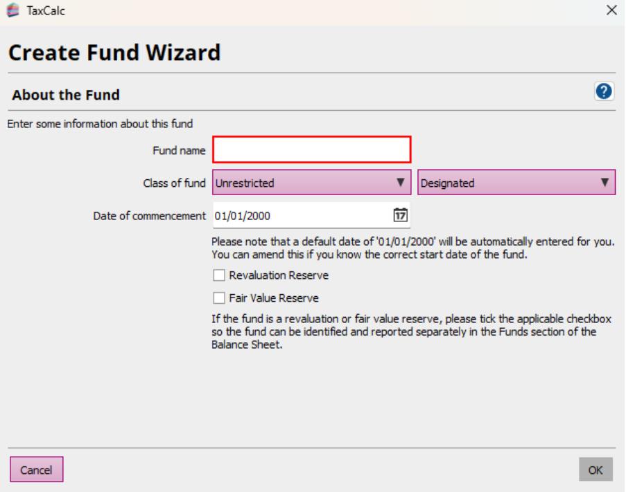 From version 16.5.460 of TaxCalc we introduced the option to create SORP compliant accruals accounts for Charitable Companies (Limited by Guarantee), Charitable Incorporated Organisations and Charitable Unincorporated Associations registered in England and Wales. These instructions will take you through the process of creating Charity accounts. Note: You can only create Charity accounts if the add-on for Charity accounts has been purchased. FundsIn the Funds screen you can create and manage the funds for your Charity clients. By default, all Charity clients will be created with a general unrestricted fund and further funds can be added by selecting Manage Funds and then Create Fund which will launch the Create Fund Wizard.