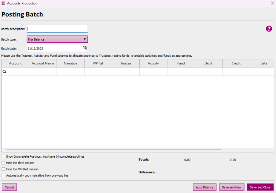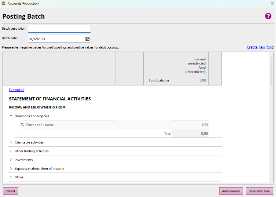 The screen is split into sections and the layout, from top to bottom, follows the format of the Statement of Financial Activities and then the Balance Sheet. Each section will allow you to select account codes that are applicable to that section. Enter code / name - enter the account to post the transaction to or select the magnifying glass icon to open a filtered version of the Chart of Accounts window. Positive entries will be interpreted as a debit transaction amount. Negative entries will be interpreted as a credit transaction amount. Funds are displayed as column headings allowing you to enter values against multiple funds for a single account code within a single row. New funds can be added using the Create new fund hyperlink without having to close the Posting Batch. Charitable Activities are displayed as rows with the Charitable Activities sections. New activities can be added using the Create new activity hyperlink without having to close the Posting Batch. The fund balance will be displayed underneath the fund name in the column heading allowing you to identify when transactions entered for individual funds don't balance. In the traditional posting batch screen, columns have been added to allow you to allocate postings to raising funds, charitable activities and funds.