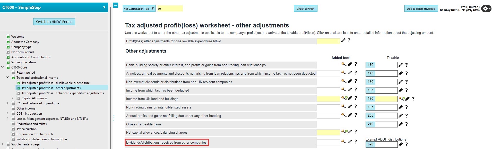 The treatment of dividend income received and where this information should be declared on the corporation tax return will depend on whether certain criteria is met (as laid out in the legislation here) which confirms some dividends/distributions are chargeable to corporation tax whilst others are exempt. Further information on exempt dividends/distributions can also be located within the CT600 guide here, specifically under text relating to box 620. From the winter update (version 16.1.200), if you are using Accounts Production and have dividend income within your postings, we recommend reviewing the information as per our knowledge base article here. In order to know how to declare the exempt dividend income/ distributions received within TaxCalc, you will firstly need to verify if the income has been included within the accounts and therefore the starting profit figure. Income is within accountsSimpleStep mode:Browse to CT600 Core > Trade and Professional income > Tax adjusted profit/(loss)worksheet – other adjustments. The profit/loss value shown at the top of the page should contain the exempt value which needs to be removed. Enter the value into the row labelled 'Dividends/distributions received from other companies' which will reduce the profits being charged to corporation tax. Please note box 620 will populate with the same value but depending on whether this amount was received from a group company or not, may mean this entry is not required. You should review this entry as needed.