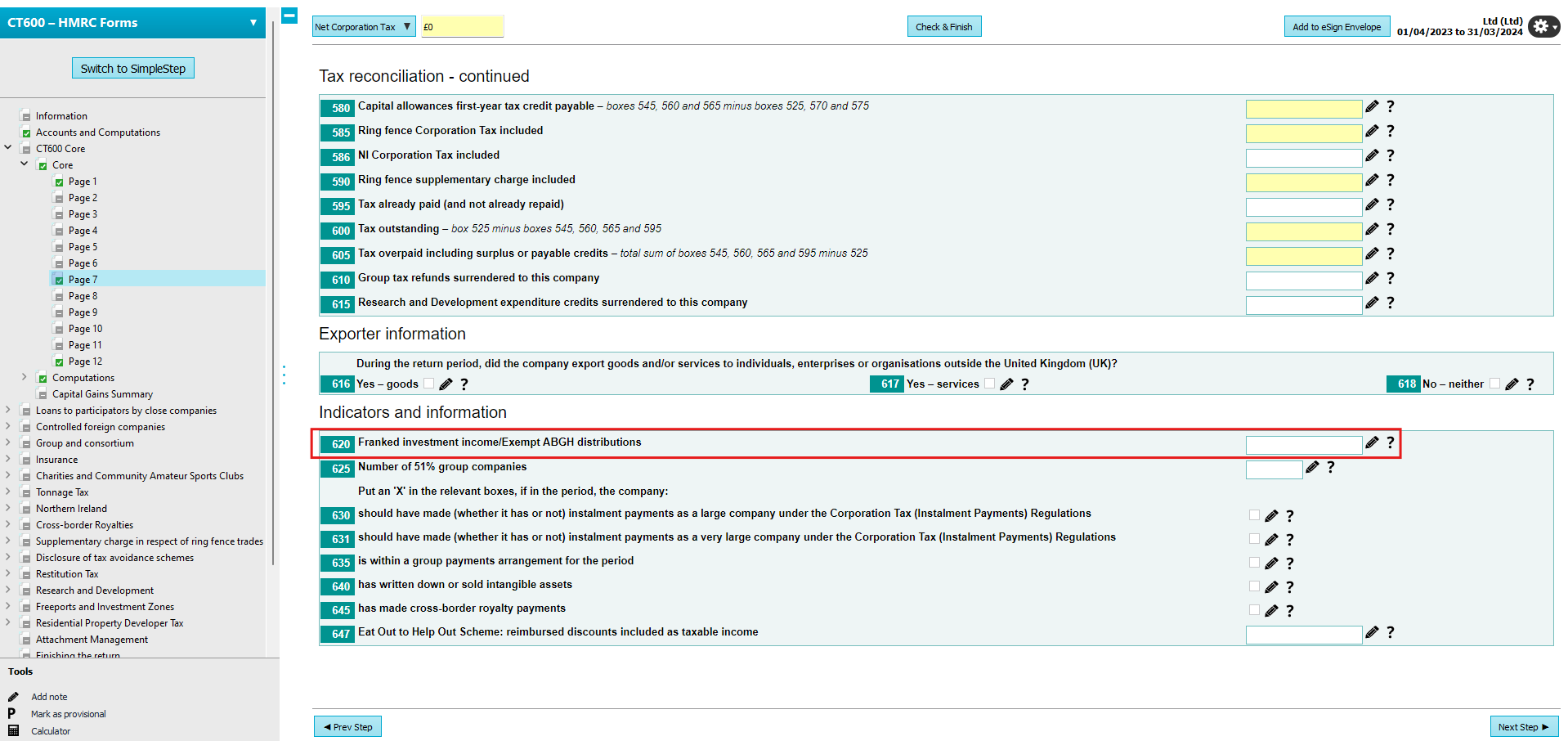 Note if the return period starts on or before 31/03/2016, the row shown will be labelled 'Net dividends received from other companies' HMRC Forms mode:Browse to CT600 Core > Computations > Tax adjusted profit/(loss)worksheet – other adjustments. The profit/loss value shown at the top of the page should contain the exempt value which needs to be removed. Enter the value into the row labelled 'Dividends/distributions received from other companies' which will reduce the profits being charged to corporation tax. Please note box 620 will populate with the same value but depending on whether this amount was received from a group company or not, may mean this entry is not required. You should review this entry as needed. Note if the return period starts on or before 31/03/2016, the row shown will be labelled 'Net dividends received from other companies' Income is NOT in accountsSimpleStep mode:As there is no adjustment needed to the trading position, you will simply need to declare the required value in box 620. Browse to CT600 Core > Trade and Professional income > Tax adjusted profit/(loss)worksheet – other adjustments. If there are any trading profits/losses, the value shown at the top of the page should not contain the exempt value. Enter the value into box 620 which appears on the row labelled 'Dividends/distributions received from other companies'. Please note if the return period starts on or before 31/03/2016, the row shown will be labelled 'Net dividends received from other companies' HMRC Forms mode:As there is no adjustment needed to the trading position, you will simply need to declare the required value in box 620. Browse to CT600 Core > Core > Page 7 and enter the value into box 620 which appears on the row labelled 'Enter the value into box 620 which appears on the row labelled 'Franked investment income/Exempt ABGH distributions'.