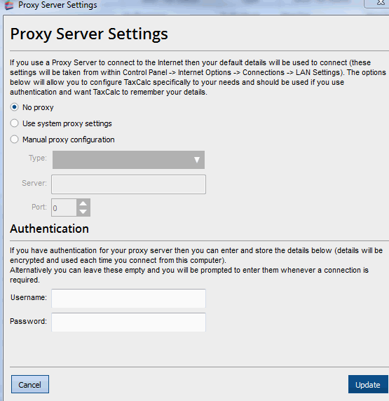 Please Note: If you are in an office environment you may need to speak to the IT department before trying to change the proxy settings. Check for updates again after any changes. From the top menu bar, go to Help > Check for updates. Success: 'Your software is up to date' or the update appears under notifications. Run the update and attempt to open your return and file online. Failure: 'Unable to retrieve product version/Couldn't resolve hostname/Null response'. Turn off Onspeed (a download accelerator) if present and file online, or speak to your office IT department to resolve. Your firewall can block a program's access to the internet. To file your return online, TaxCalc will need access. Read the Knowledge Base article for How do I configure my firewall software? to find out how to fix this. Check Proxy Server Settings Dialog within TaxCalc